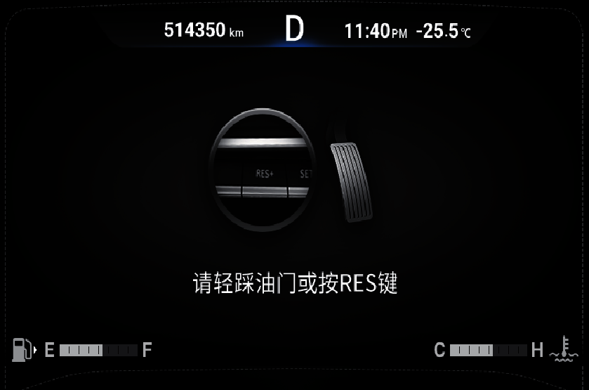RES+:增加存储的车速或重新启用自适应巡航控制并恢复存储的车速。