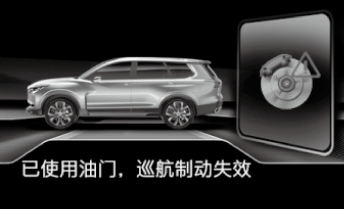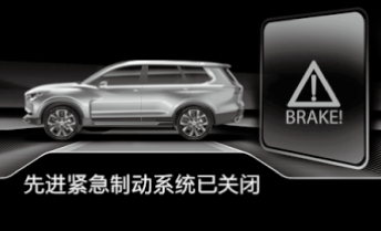 自适应巡航控制系统可利用脚制动器制动能力的约40%,如果在高速工况下前车紧急刹车,自适应巡航控制不足以将车辆减速至安全的车速范围,此时组合仪表会提示“请踩制动踏板”,驾驶员必须立即采取制动措施。