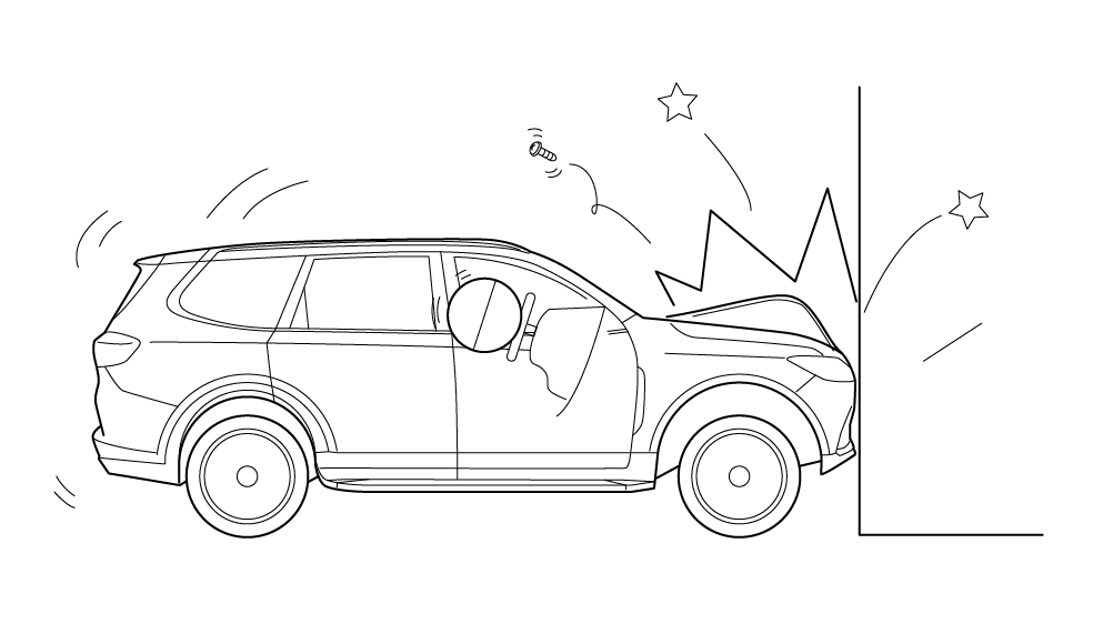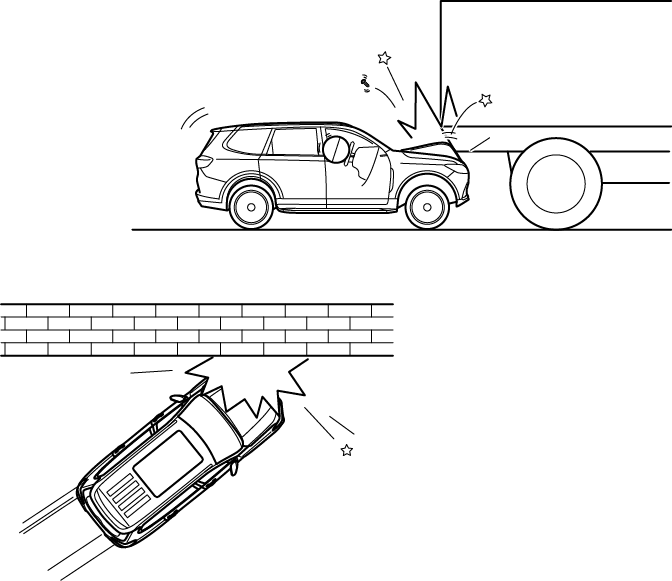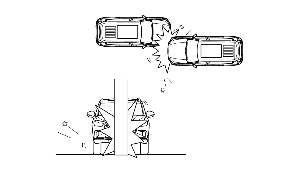 • 与坚固的电线杆、交通标志杆、树木等小面积物体正面碰撞时。