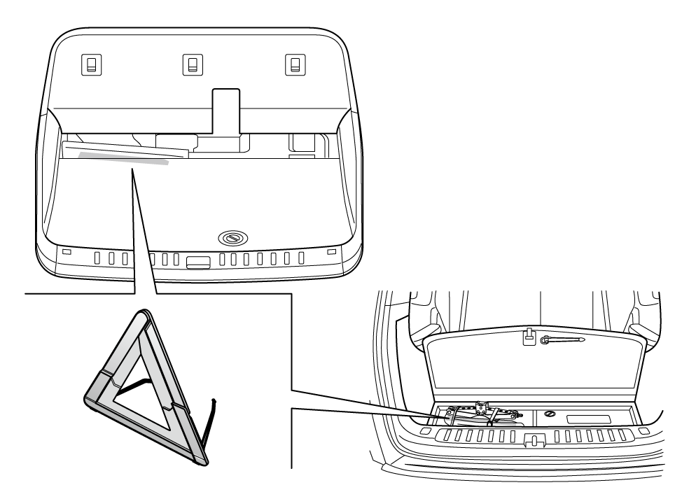 三角警示牌放在后行李箱下方(适用于三排座椅车辆)或第二排座椅后方(适用于二排座椅车辆)。
