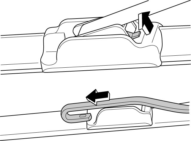 — 推动固定夹(箭头方向),然后将刮片支架向支臂沿着箭头方向滑动,以便使支架上的枢轴从支臂上的挂钩中松脱。