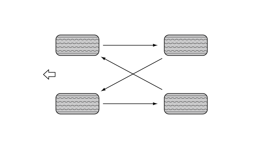 轮胎更换位置时,应检查不均匀磨损及损坏情况。不正常磨损通常是由胎压不正确、车轮定位不良、车轮动平衡不良、紧急制动或紧急转弯导致的。检查胎面或轮胎侧面是否碰伤或隆起,如果发现其中一种状态则应更换轮胎,如果看见织物或绳线也要更换轮胎。在轮胎换位后,应按照车辆上的胎压标签所示调节前后轮胎的充气压力并检查车轮螺母的拧紧度。
