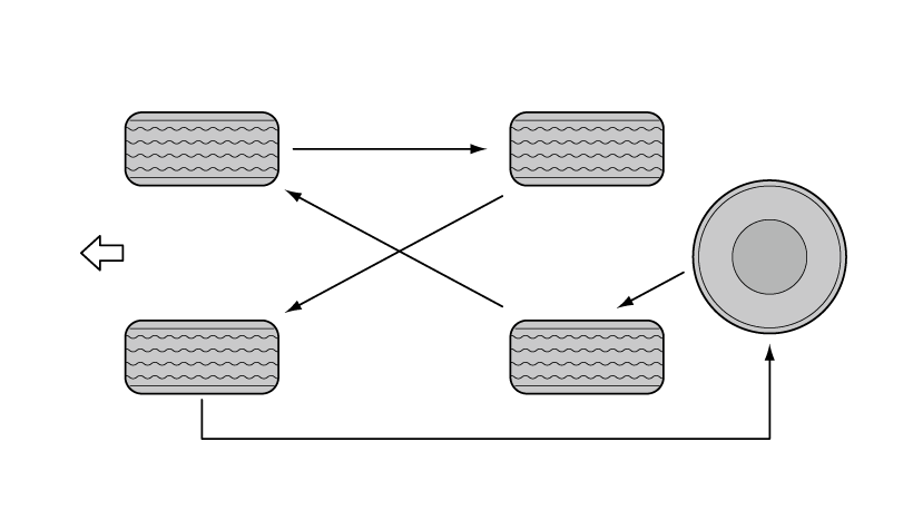 为使轮胎磨损均匀,建议车辆每行驶5000公里时应进行轮胎检查及前后交叉换位,并按要求检查整车整备质量下的车轮定位参数。若发现不规则磨损,则应更换轮胎位置,必要时进行车轮定位调整。更换轮胎位置时,检查轮胎是否正确动平衡。