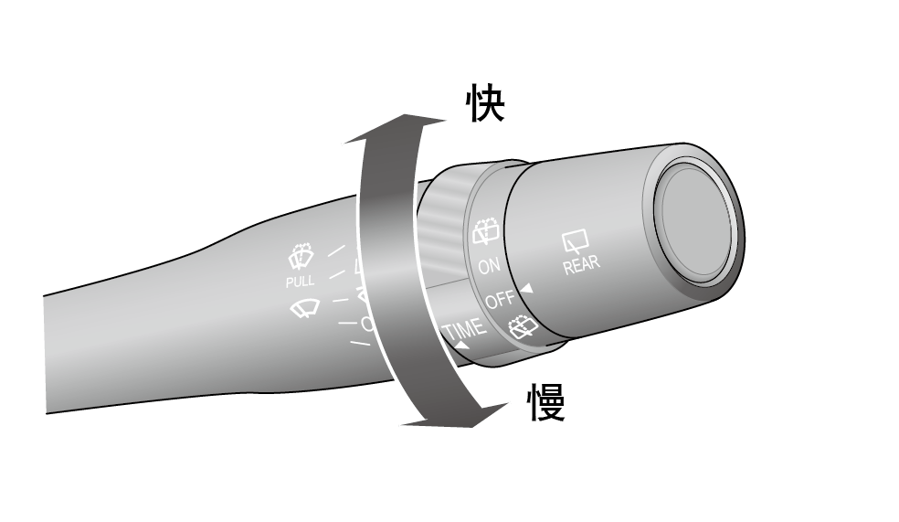 对于配备雨量传感器的车辆,当拨杆开关位于(间歇)位置时,旋转开关以改变前雨刮灵敏度,雨量传感器调整前雨刮的刮水速率。
