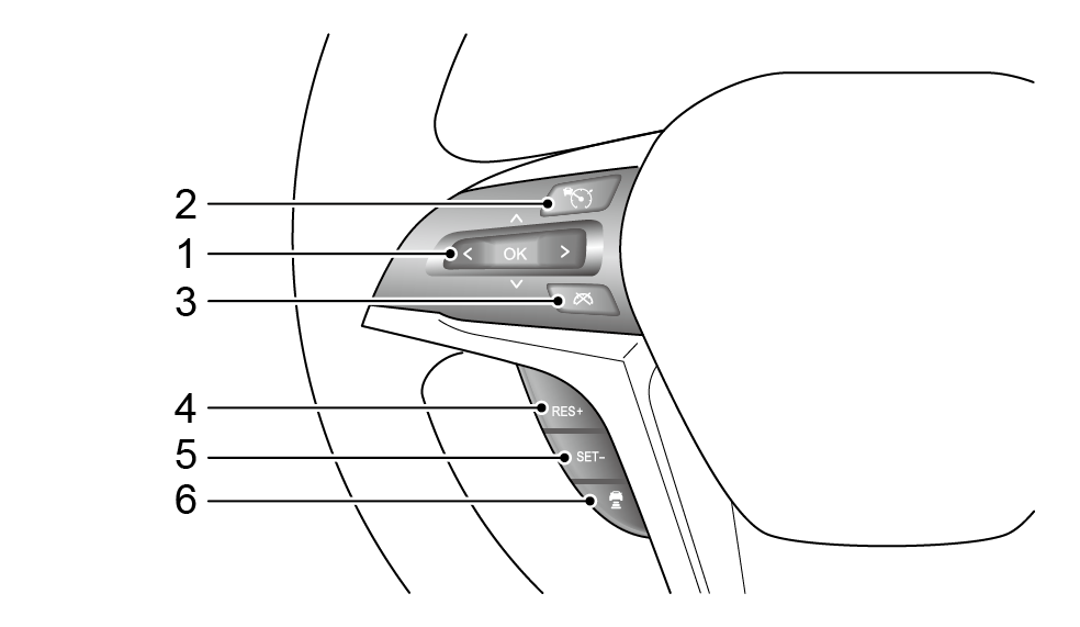 位置4–RES+:巡航恢复/加速开关。如果存储设定车速,则按下此开关可恢复此车速,如果再次按下此开关可以加速,每按一次可增加车速1公里/小时。