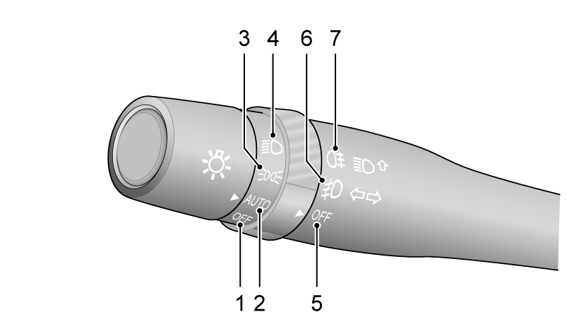位置6–:前雾灯打开。当点火开关位于“ON(开启)”位置时,将开关旋至位置即可打开前雾灯。当灯光控制开关处于AUTO位置,开关旋至位置时,前雾灯会根据周围环境随大灯点亮或关闭。前雾灯打开时,组合仪表上的“前雾灯指示灯(绿色)”点亮。
