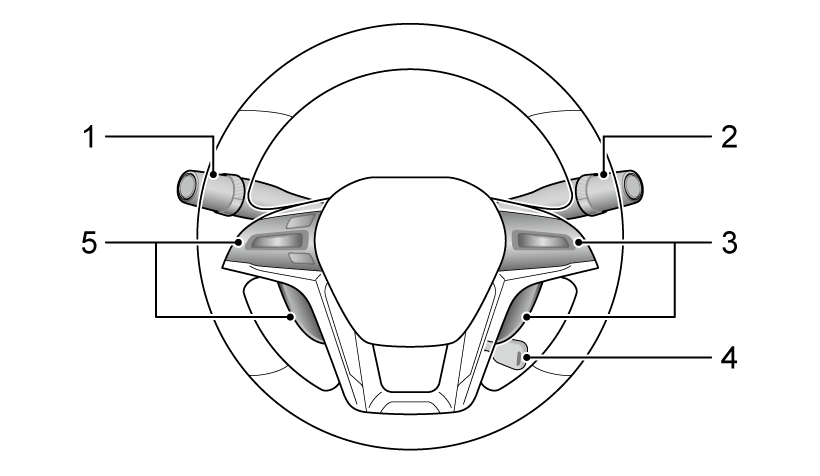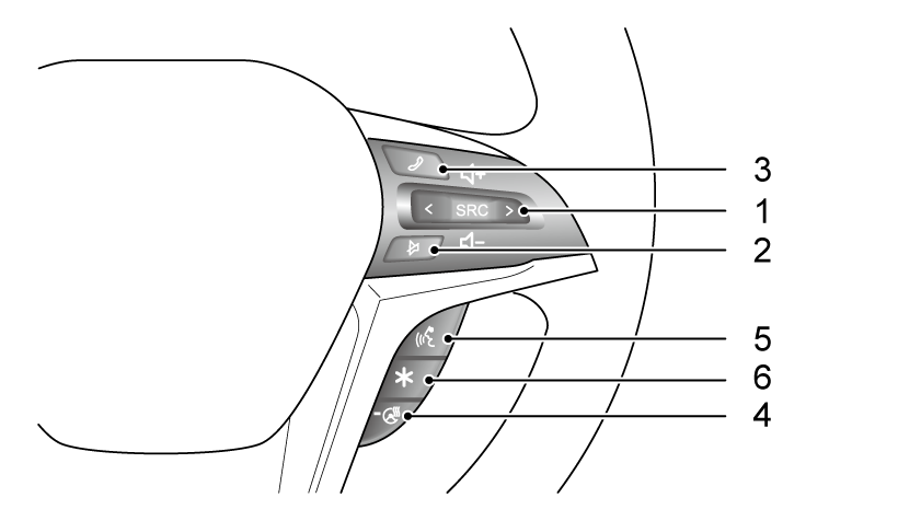 位置6–:自定义设置开关。按下此开关开启自定义设置。请与带车联网功能娱乐系统中支持自定义设置的相关功能结合使用。例如进入车辆设置,然后选择方向盘,对自定义设置开关进行设置(对讲/抓拍功能):