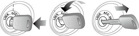 为了将钥匙从点火开关中拔出,先将其逆时针旋转至“ACC(解锁)”位置。然后将钥匙朝点火开关压下并继续逆时针旋转至“LOCK(上锁)”位置。此时即可拔出钥匙。