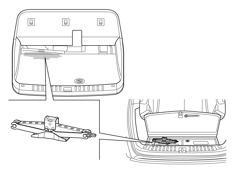 千斤顶放在后行李箱下方(适用于三排座椅车辆)或第二排座椅后方(适用于二排座椅车辆)。