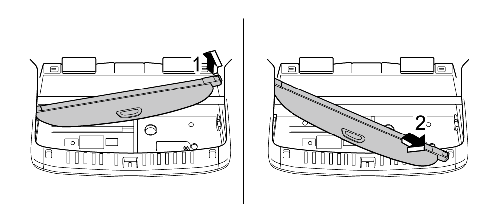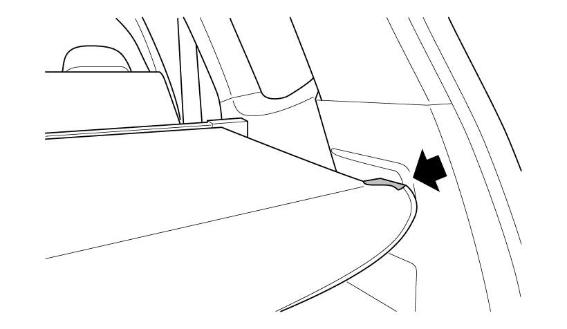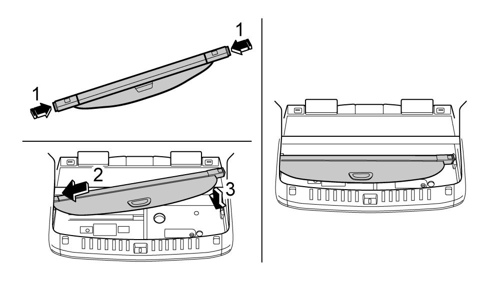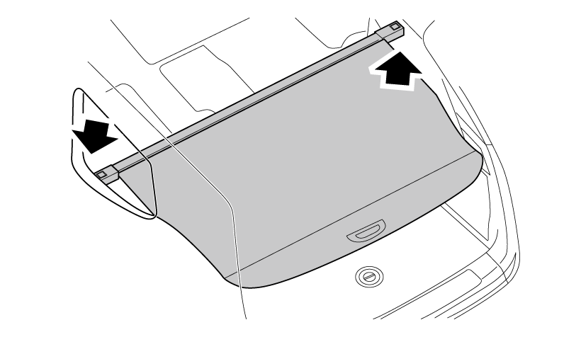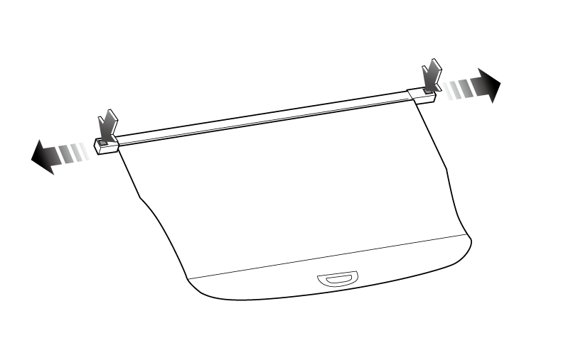 首先从行李箱中取出行李箱遮物帘。先从右端用右手拿起(1),然后沿图中(2)平移拿出。