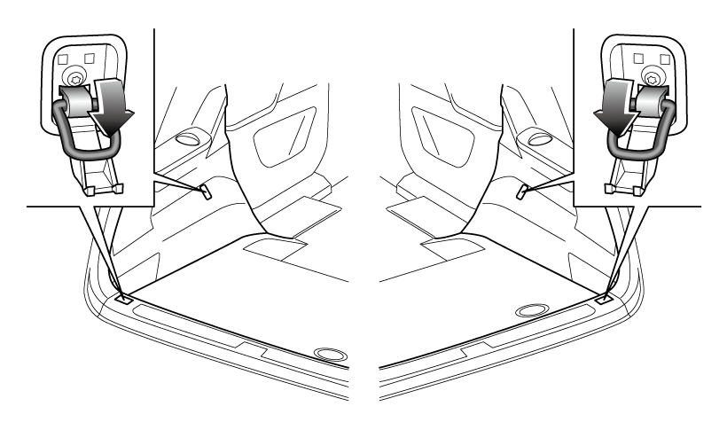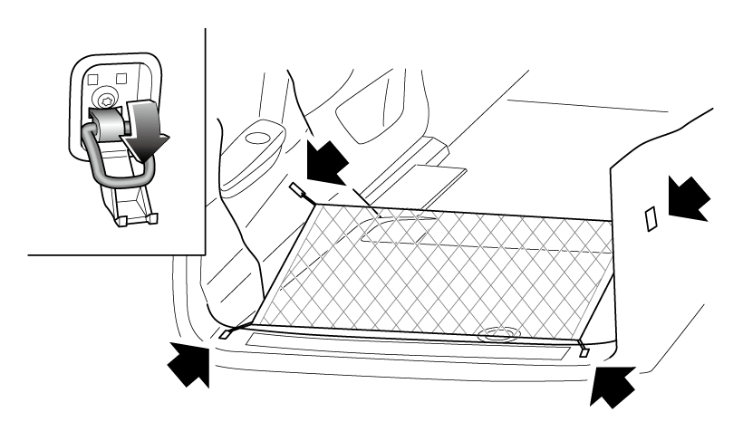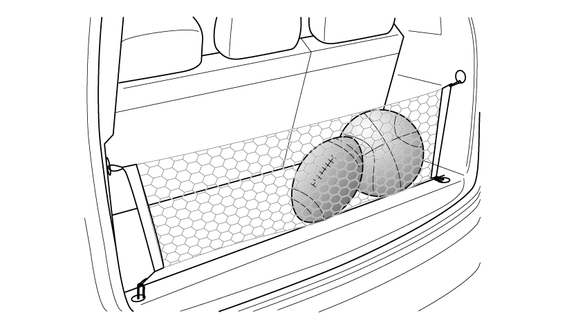 首先需要将第三排座椅靠背向前折叠放平(具体操作请参阅驾驶之前章节中的座椅),然后将网兜四个绑带挂到捆扎环上,如下图所示。