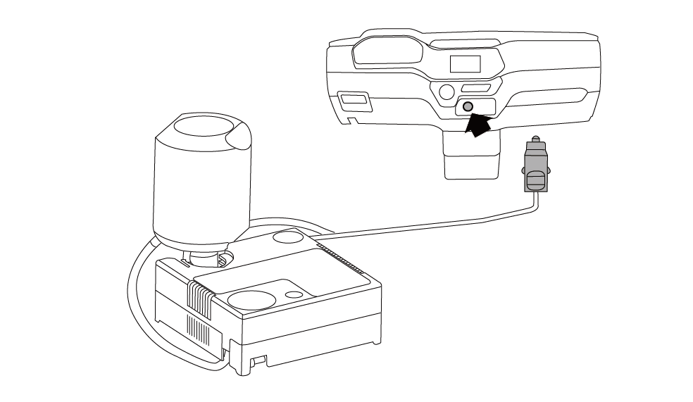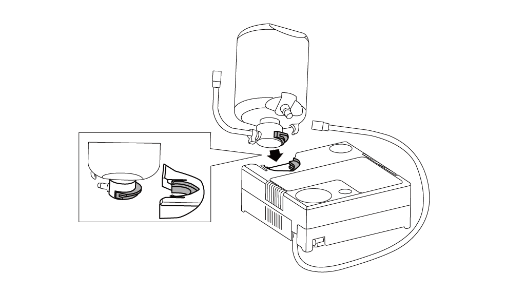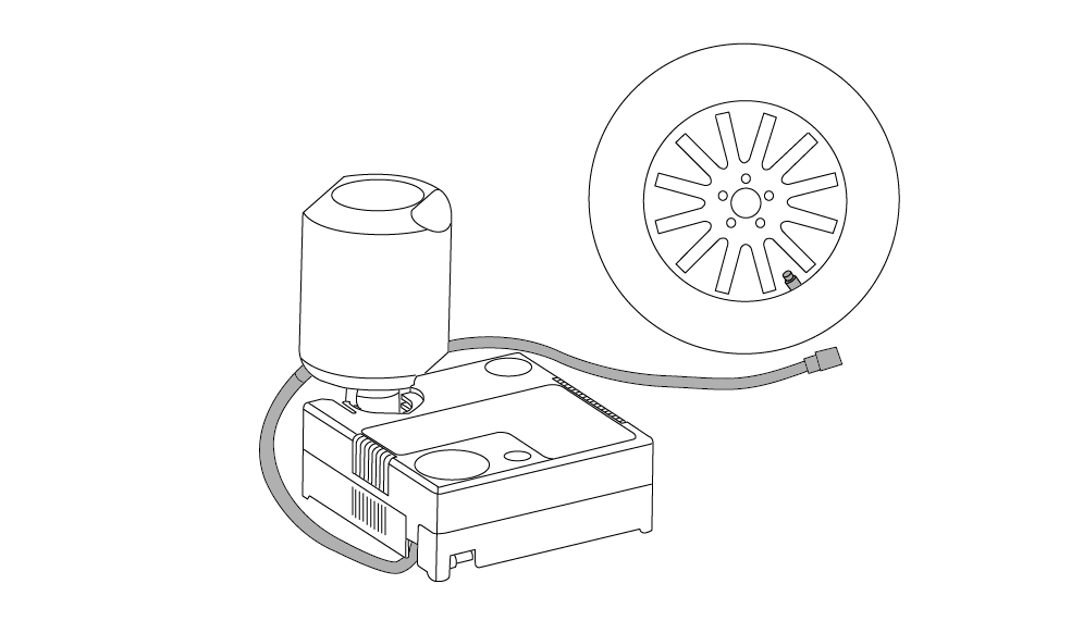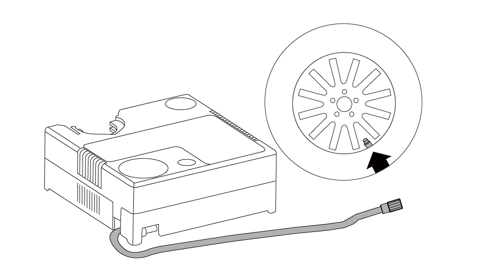 1. 确认此时开关为关闭状态。松开补胎胶罐上的胶水管,将胶罐接口对准泵体上的胶罐卡口水平推入,安装好后将充气管连接到胶罐上。