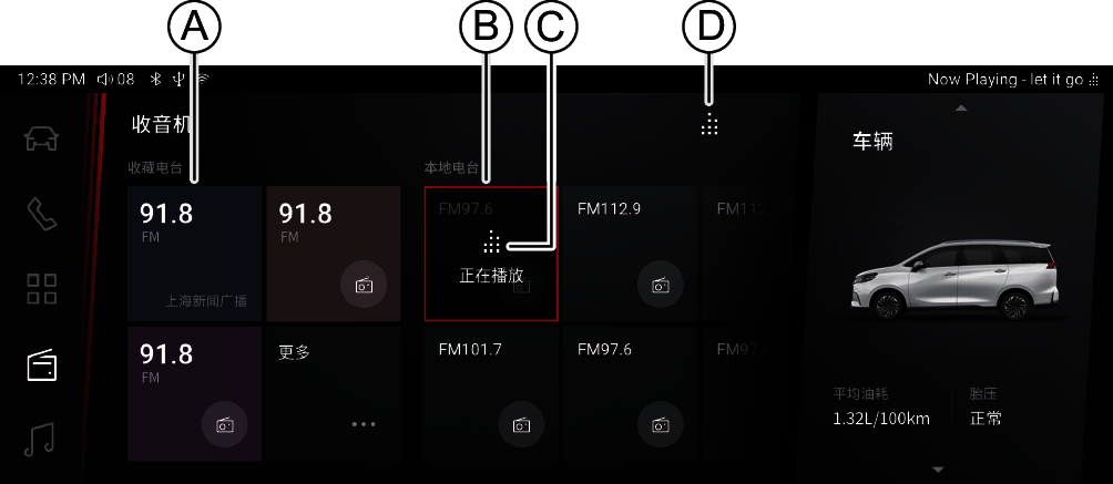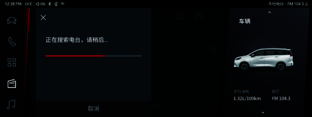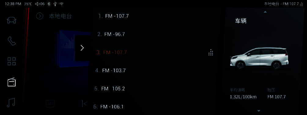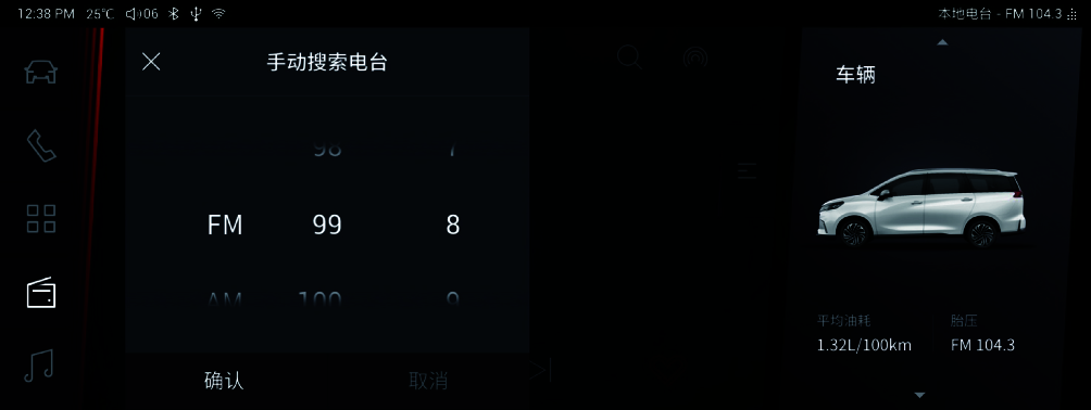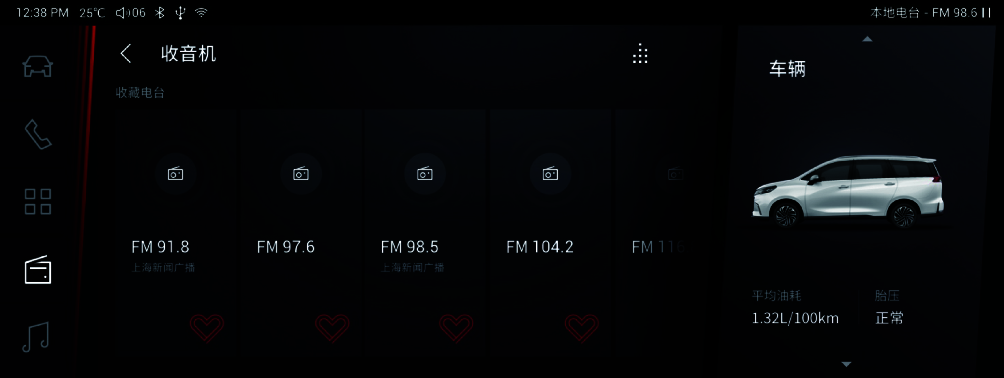 点触显示屏最左侧竖条快捷入口Dock栏中的收音机图标,进入收音机界面操作。如下图: