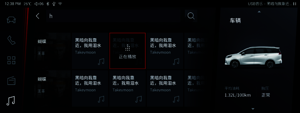 点触显示屏最左侧竖条快捷入口Dock栏中的音乐图标,进入音乐界面操作。如下图: