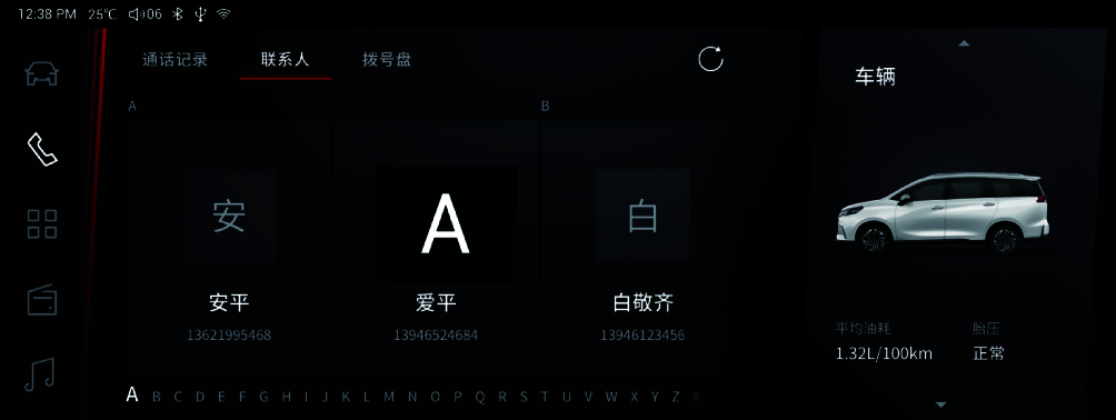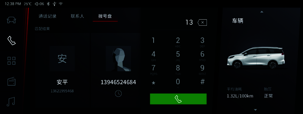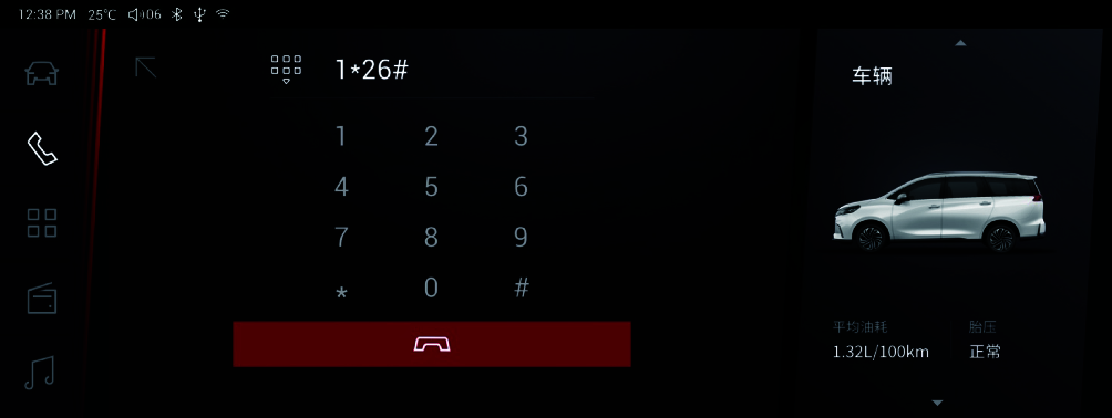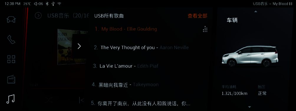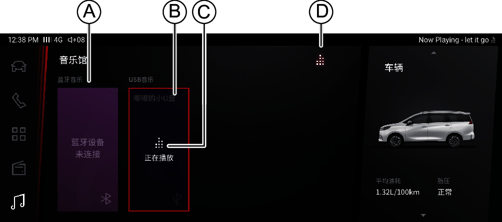 在无播放状态下,显示车况信息;在有播放状态下,显示当前最近一次打开应用状态(USB音乐/蓝牙音乐/收音机)。