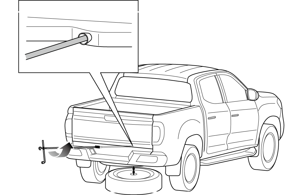 备胎到达地面后,持续逆时针转动车轮螺母扳手并向外拉出备胎。禁止过度转动板板手,否则会损坏备胎装置。