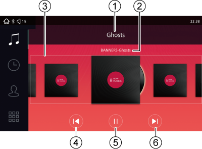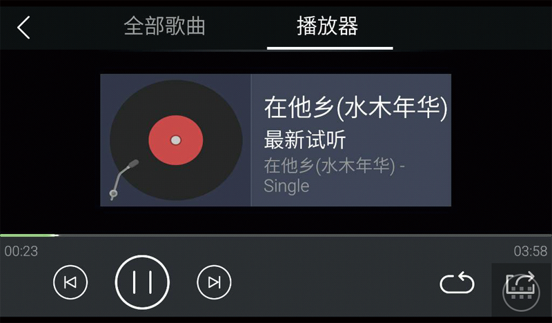 当首次进入音乐时会进入列表界面,因没有播放任何曲目,故不会出现返回键,可点击任意曲目进入播放界面。