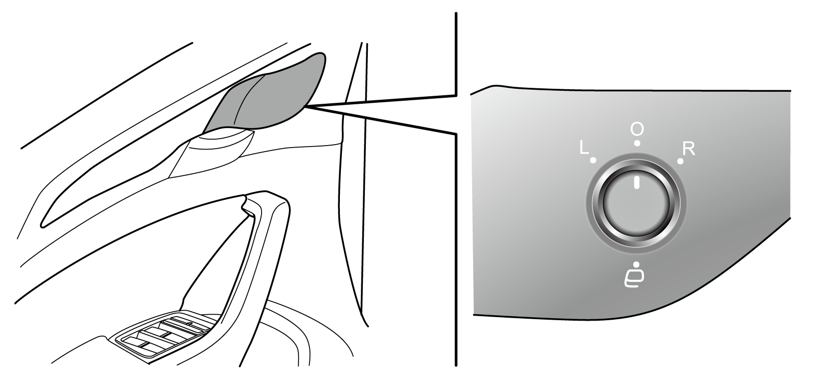 当后视镜状态为折叠状态时,将点火开关打到“ACC”/“ON”位置,将开关打至L/O/R位置,后视镜打开。