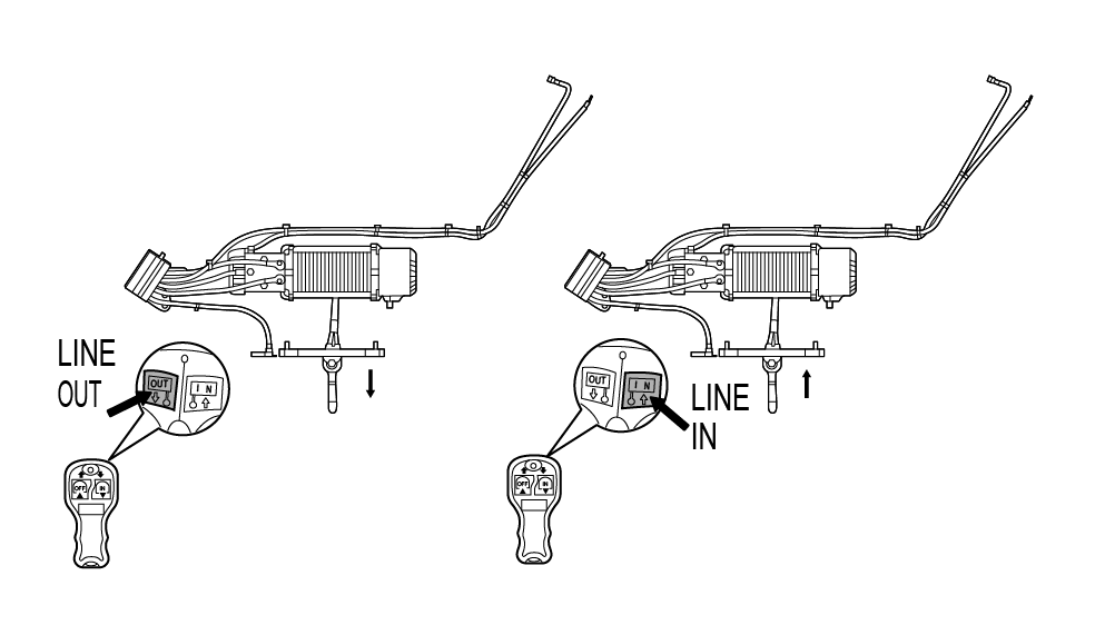 负载时,纤维绳可能相互交叉挤压在一起。此时,请不要试图用手去排整相互挤压的纤维绳,而用控制控制手柄,交叉按动“IN”和“OUT”,使绳筒分别正转和反转达到排绳的目的。整齐,紧凑的排绳能避免纤维绳相互交叉挤压。