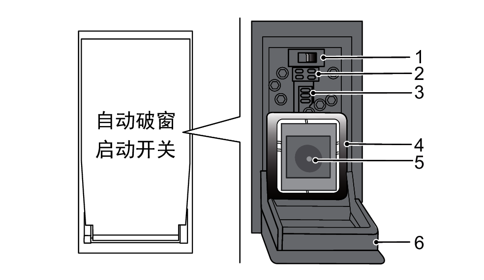 在紧急情况下,打开控制器保护盖(6),按碎破玻开关保护盖(4),然后按下破玻开关(5),即可实现自动破玻。