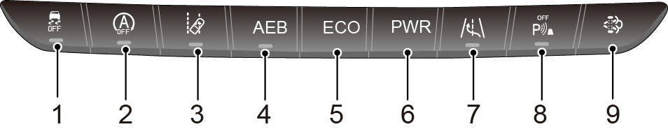 位置4–AEB:自动紧急制动开关。点火开关打到“ON(开启)”位置时,自动紧急制动系统默认开启,开关上指示灯点亮。按下AEB关闭自动紧急制动系统,开关上的指示灯熄灭,组合仪表上的“FCW(前碰撞预警)/AEB(自动紧急制动)警告灯”呈黄色点亮。再次按下即可启动自动紧急制动系统。更多信息请参阅起动与驾驶章节中的驾驶辅助系统