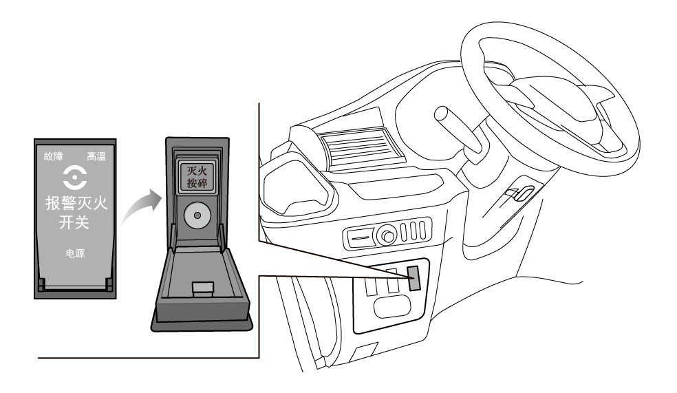 发动机舱自动灭火器开关在驾驶员侧仪表台上,可使驾驶员在遇紧急情况下直接进行操作。在发动机发生火灾时,打开发动机舱自动灭火器开关面板,用力按下方形红色塑料片,使其离开原来位置,以启动红色塑料片下方的发动机舱自动灭火器开关,引发发动机舱自动灭火器进行灭火功能。